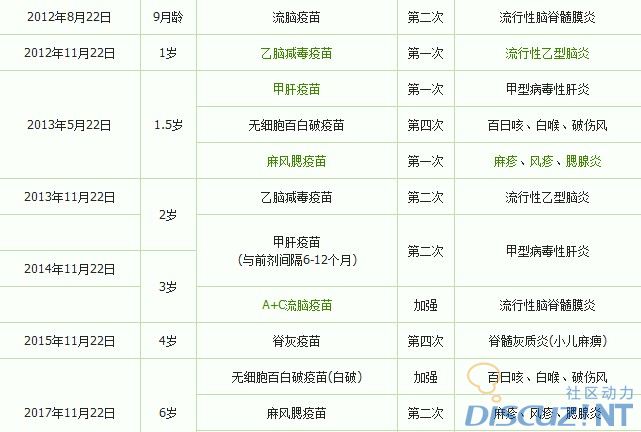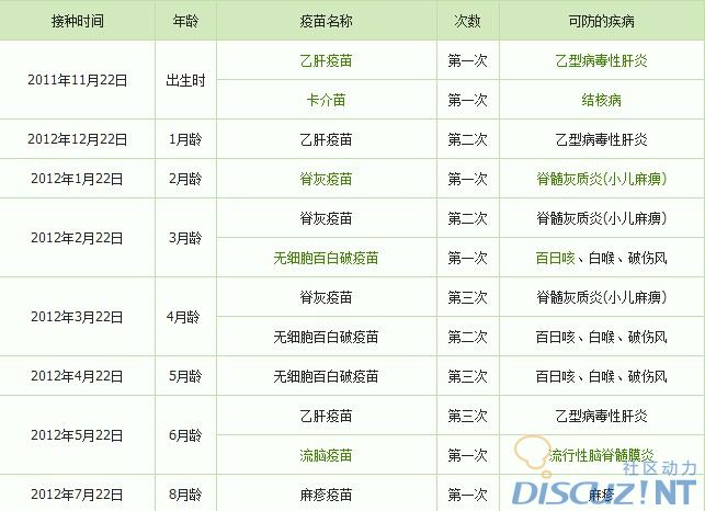 假设是2011年11月22日出生的宝宝,这个时间就是疫苗的推荐接种时间。不同地区略有不同,仅供参考……