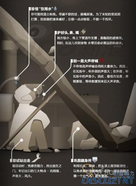 【导读】在地震中,不少无辜者并不因房屋倒塌而被砸伤或挤压伤致死,而是由于精神崩溃,失去生存的希望,乱喊、乱叫,在极度恐惧中"扼杀"了自己。乱喊乱叫会加速新陈代谢,增加氧的消耗,使体力下降,耐受力降低;大喊大叫,必定会吸入大量烟尘,易造成窒息增加不必要的伤亡。