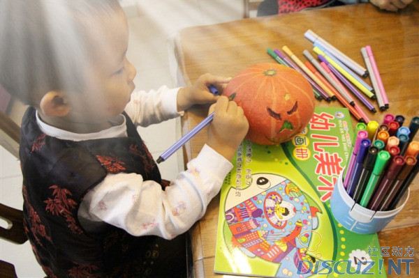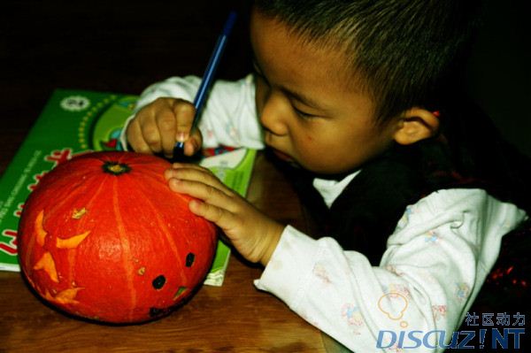 昨天在家想了大半天,与凯凯过第一个万圣节,到底要做什么东西呢?凯妈我一边收拾家务一边在想啊想,最后想想就做一个最简单的“南瓜怪物”吧。说做就做,凯妈带着凯凯到小区10多分钟的小市场买南瓜去,在小市场转悠了10分钟才找到了算是凑合的南瓜,没有比这个更好的了。买到南瓜兴高采烈的回家,期待我们两个的作品快快出炉。可惜回到家,已经3点了,凯凯该睡午觉了,凯妈也小睡了一会,趁凯凯还没醒来,凯妈就开始雕刻南瓜的“怪脸”,因为这个步骤稍微有点危险,凯妈自己搞定就好了。凯凯一觉睡到吃晚饭的时间,吃好饭之后,凯妈收拾完毕。当当当当,凯凯,看妈妈弄的“南瓜怪物”出来了,凯凯哈哈的大笑起来,凯妈告诉凯凯,你来给“南瓜怪物”们脸蛋上化化妆吧?凯凯高兴得马上去拿水彩笔去了,安静的坐在那给“小怪物”们装饰去了。一会儿,4个“小怪物”诞生了,凯凯拍拍手说,成功了。凯妈最后还给“小怪物”们做了一个头饰,可惜有点晕,弄反了。下面来看凯妈和凯凯的现场直播吧?