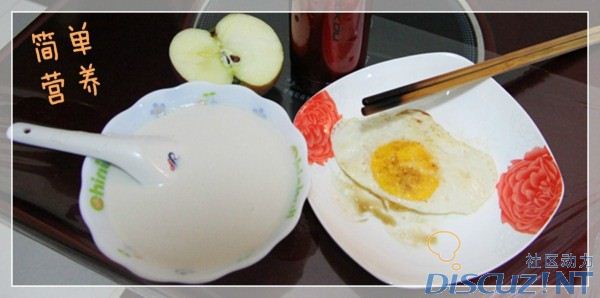赶紧起床把自己收拾停当,接下来的一秒就会厨房交响乐响起,得,得,得,还得先把女儿的房门掩一下,豆浆机声音有点大,切葱的声音也不小,锅铲亲密接触锅也响亮,还好姑娘的熟睡程度不一般。喜欢每一周的每一天都变换着花样给女儿做既简单又营养的早餐,豆浆牛奶交替,今天饺子,明天鸡蛋面,后天南瓜饼……不过大家理解哈,这么紧的时间里没时间拍照,只有一张做得最简单的:牛奶汤圆 煎蛋 苹果(别笑,那筷子的黑是消毒柜惹的祸)